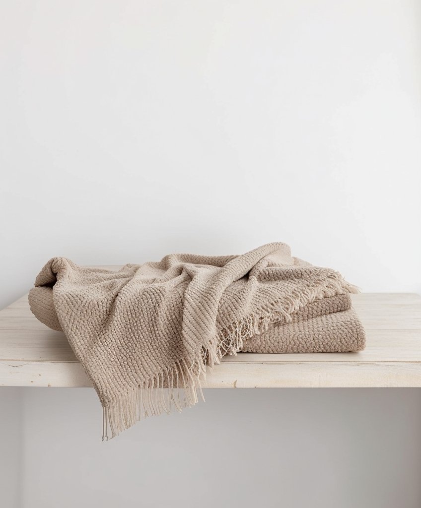 Połączenie miękkości, stylu i chłonności, przemyślane detale, jak choćby delikatne frędzle.